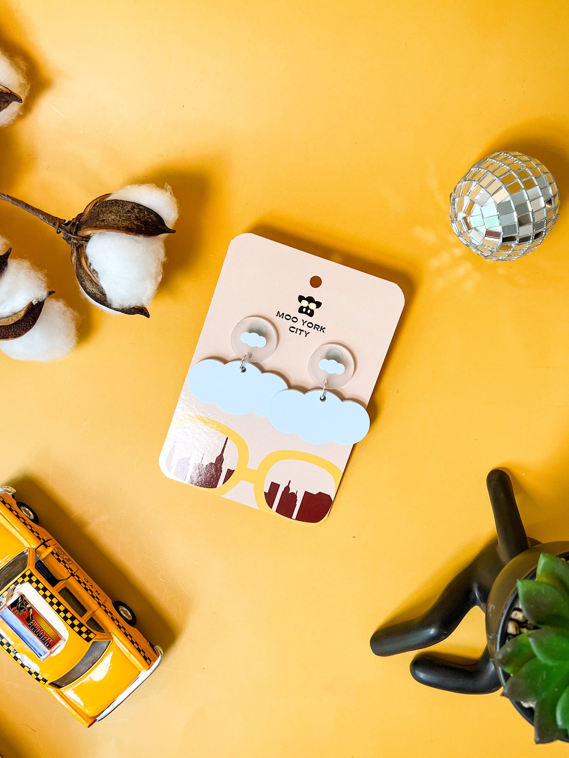 Keep your head in the clouds with these lightweight and funky statement earrings. Matte sky blue acrylic paired with a frosted clear. These post earrings hang 2” long and 2" wide and are made with nickel-free silver-plated posts.