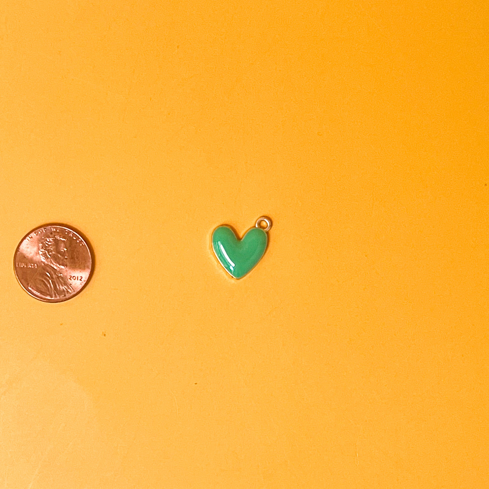 Enamel mint green heart charm. 0.6" long and 0.5" wide. Purchase as a standalone charm, or add it to your cart along with a Make Your Own jewelry item for it to be assembled as your own unique piece.