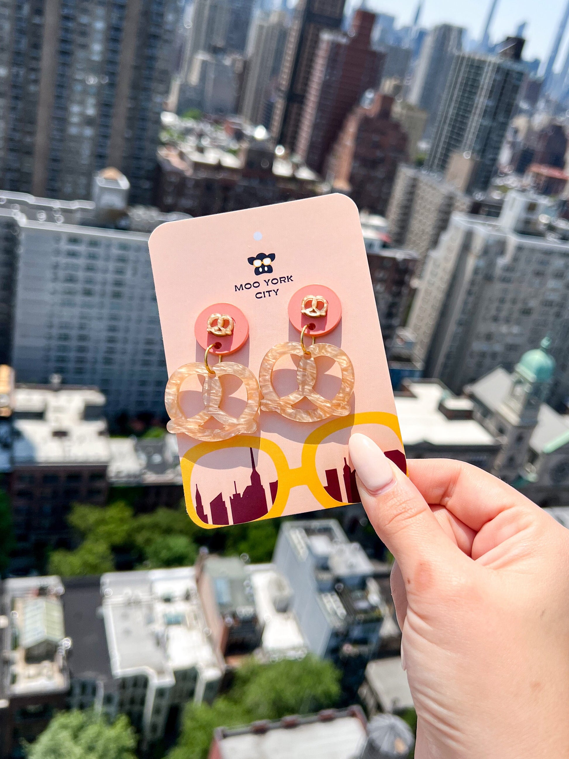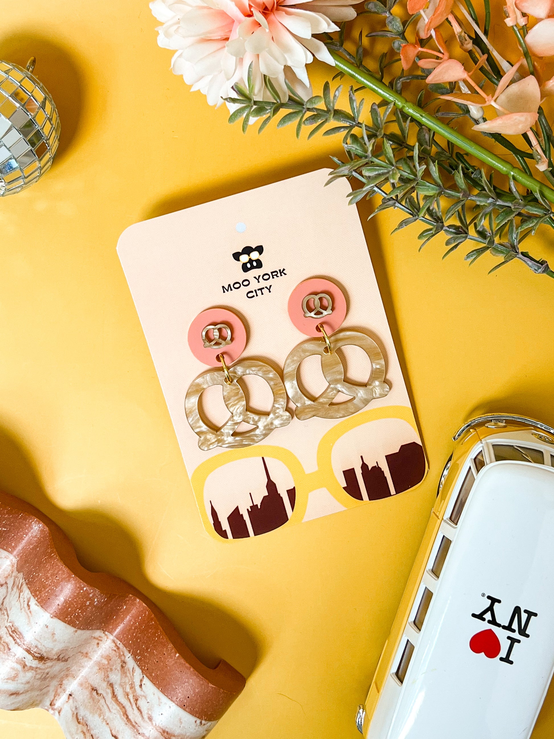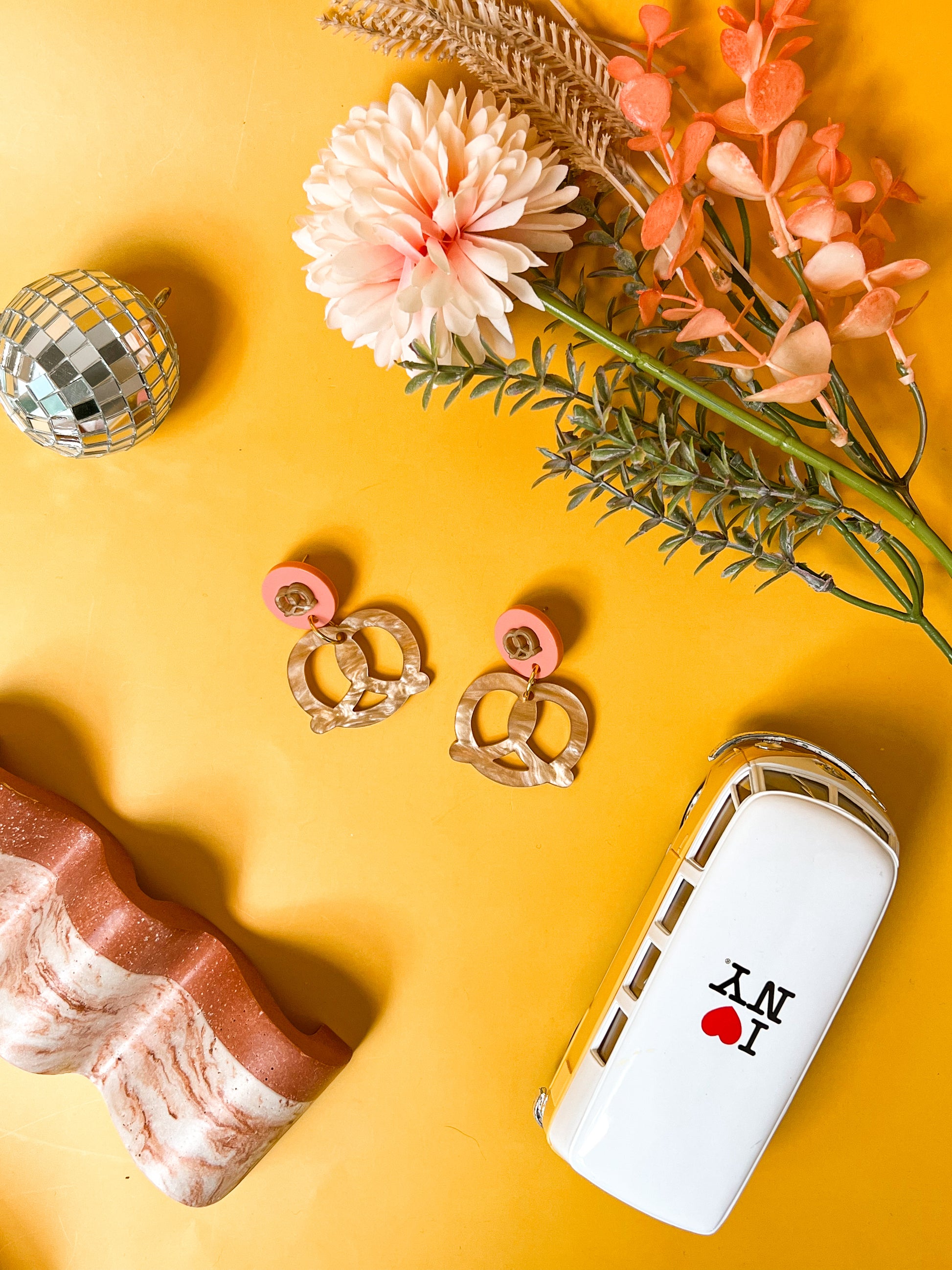 BE the snack with these lightweight and funky statement earrings. Matte coral acrylic paired with a glittery beige pearl. These post earrings hang 2.25” long and 1.5" wide and are made with nickel-free gold-plated posts.